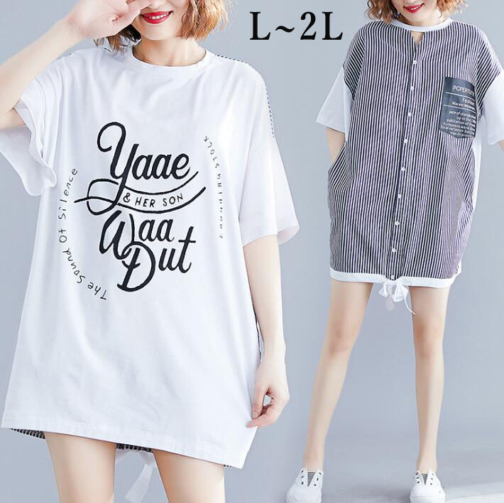前後2WAYTシャツシャツオーバーサイズ ゆったりTシャツ チュニックロゴ半袖ストライプロングシャツ 大きいサイズ切り替えクルーネックビッグシルエット体型カバー春夏LXL