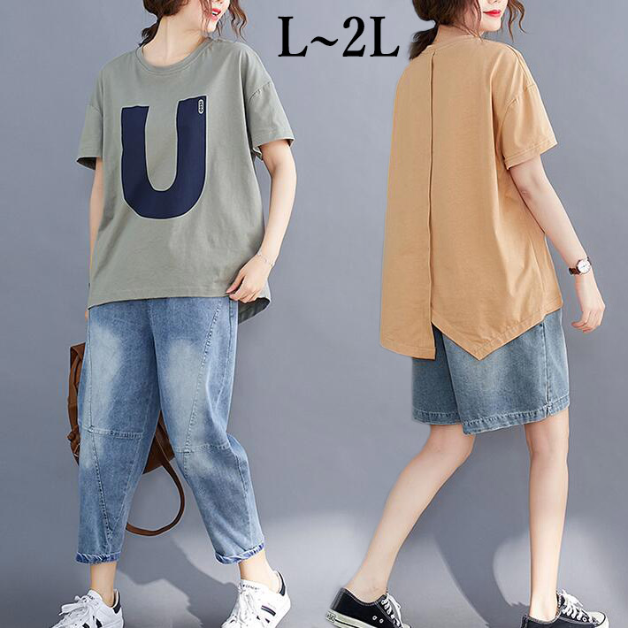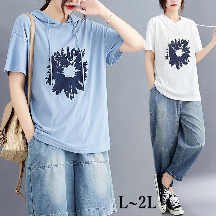 フードコットンオーバーサイズゆったりTシャツロンクTシャツ Tシャツチュニックプリント半袖大きいサイズクルーネックビッグシルエット体型カバー夏L2L