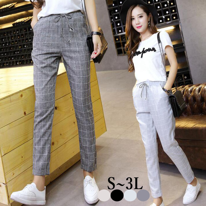 スリムパンツチェックパンツテーパードパンツクロップドパンツ 腰紐ストレート チェック柄レディースボトムス ウエストゴム 大きめSM L2L