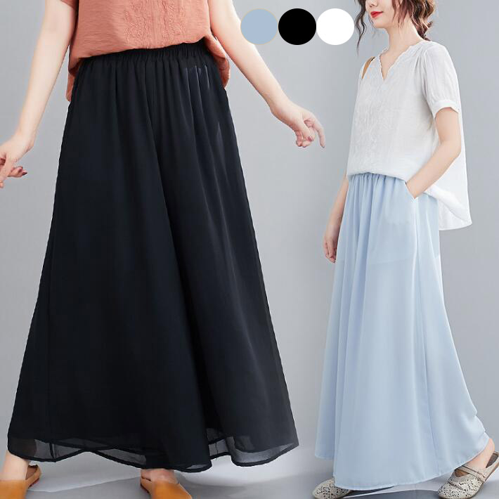 スカーチョシフォンパンツワイドパンツワイドワイドチノガウチョパンツ ワイドパンツウエストゴム ガウチョ スカーチョ スカンツ フレア揺れるレディースハイウェスト