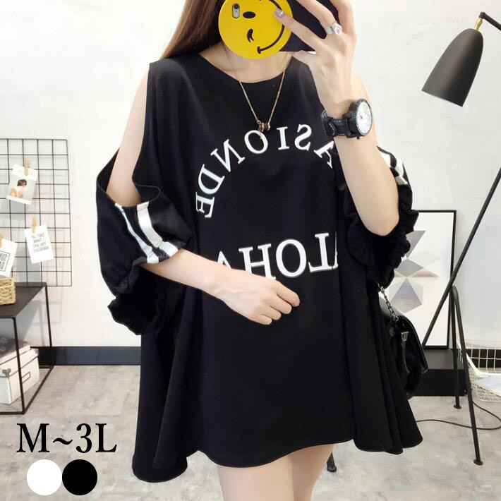 オフショルダーTシャツ オフショルダーTシャツゆったりTシャツフリルTシャツロゴプリント フリル半袖トップスレディース 肩だし 肌見せ 肩開き オフショル大きめM L2L3L