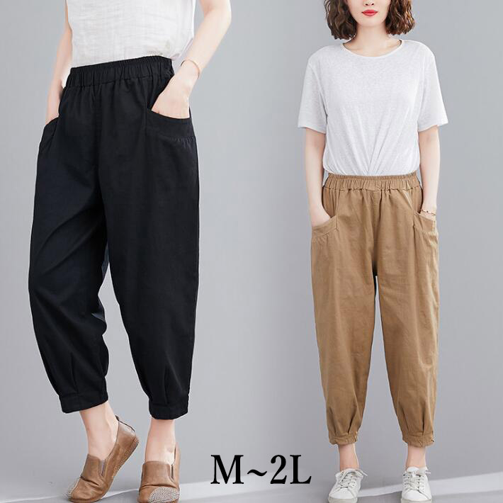 リネンサルエルチノパンテーパードパンツ綿麻パンツ ウエストゴム9分丈レディースボトムス ゆるパンオーバサイズ大きめ ML2L