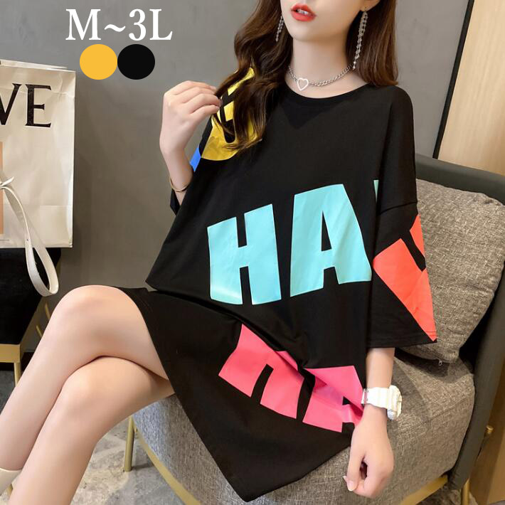 TシャツロゴTシャツ ロングTシャツオーバーサイズ ゆったりTシャツ チュニックロゴ7分袖半袖ロング 大きいサイズクルーネックビッグシルエット体型カバ ML2L3L