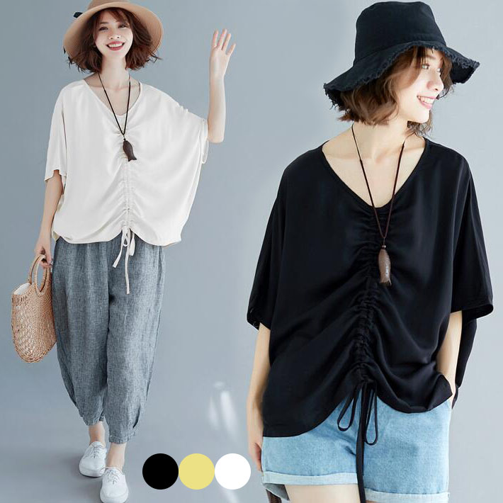 ドルマンシャツドルマンドレストリボン ギャザーネックロングシャツオーバーサイズ チュニック5分袖半袖ロング 大きいサイズクルーネックビッグシルエット体型カバー