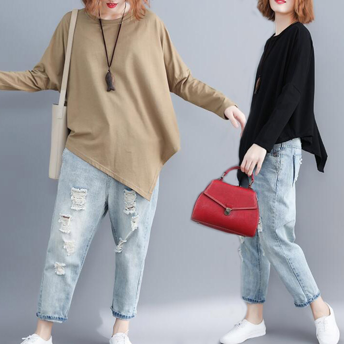 シャツカットソー クルーネックアシンメトリートップスレディース長袖ビッグシルエットオーバーサイズ大きめゆったり体型カバ 着痩せ トレンド