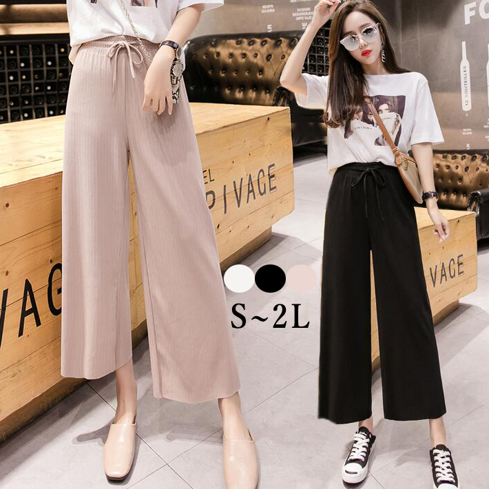 ガウチョパンツ ワイドパンツスカーチョニットパンツワイドリボンウエストゴムロングパンツレディースハイウェストSML2L