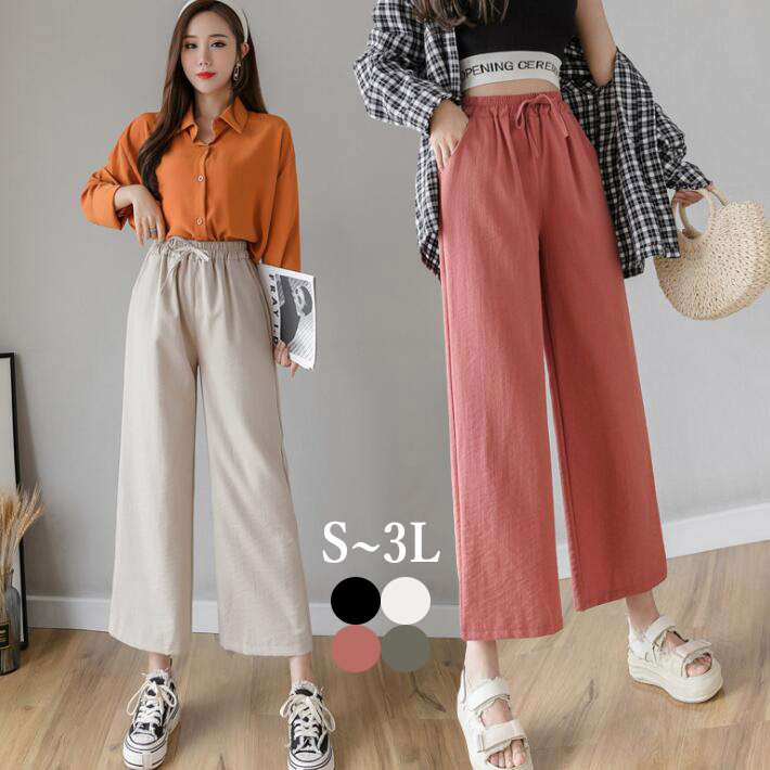 ガウチョパンツ リネンパンツワイドパンツスカーチョ リネン綿麻パンツワイド紐ウエストゴムロングパンツレディースハイウェストSML2L3L