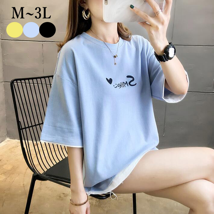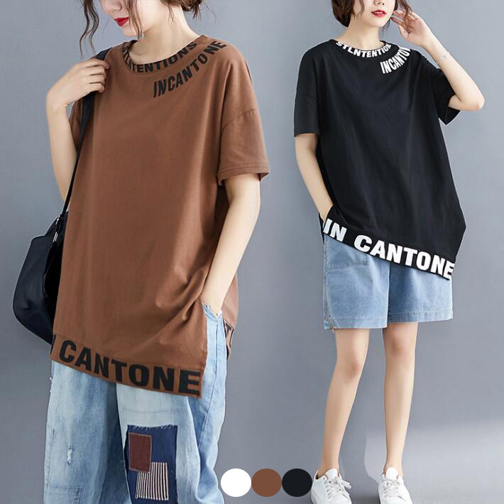 Tシャツ アシンメトリーTシャツトップスミディアムロゴプリント英文字 レディース半袖 大きいサイズ小さいサイズシンプルゆったりオーバサイズ