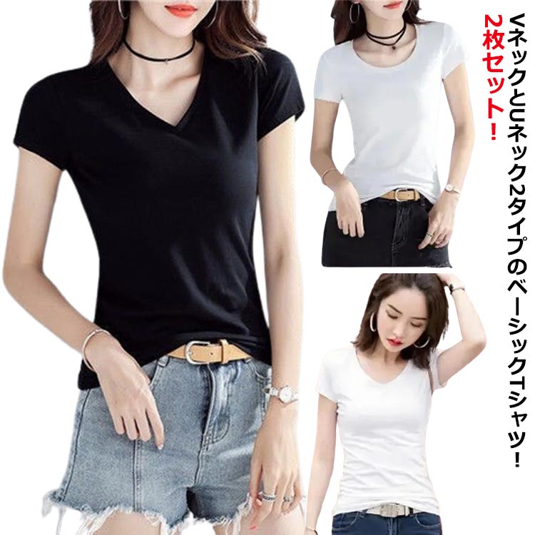 VネックTシャツ レディース 半袖tシャツ 2枚セット Vネック 丸首 Tシャツ レディース 半袖 白 黒 カットソー インナー 大人 トップス