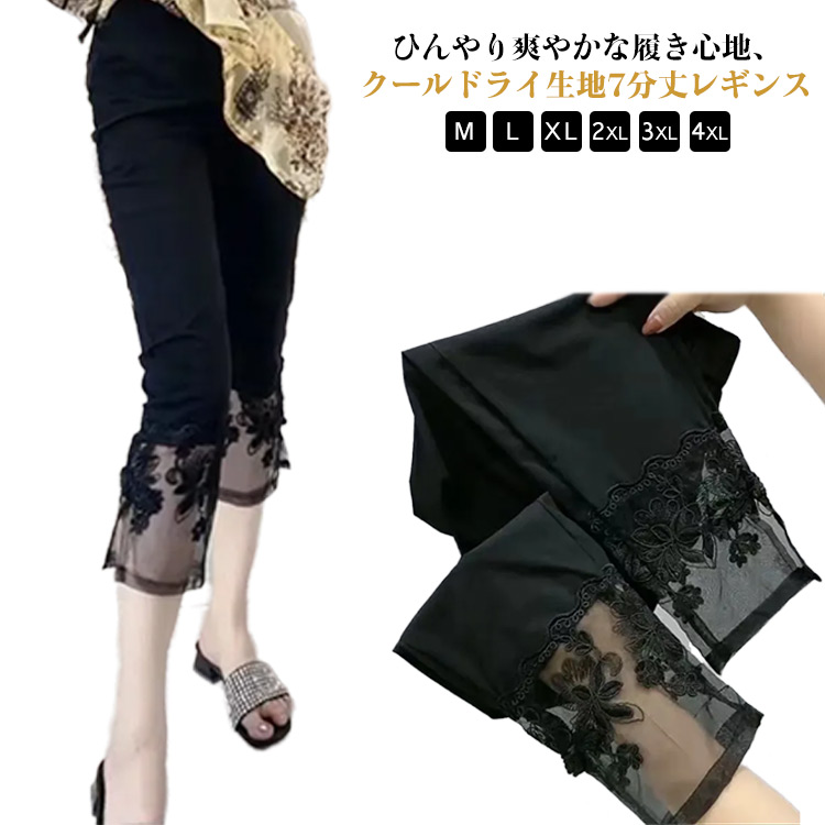 M~4XL 7分丈 レースレギンス きれいめ 薄手 夏服 ストレッチ 美脚 黒レディースファッション ボトムス パンツ