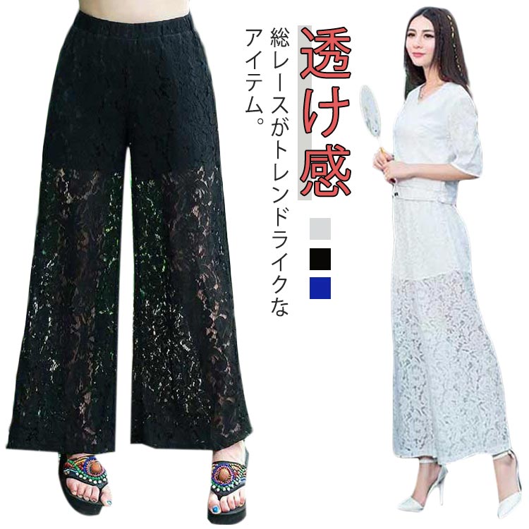 レースワイドパンツ レースパンツ ワイド ロング 肌見せ 透け感 涼しい 通気性 リラックスパンツレディースファッション ボトムス パンツ