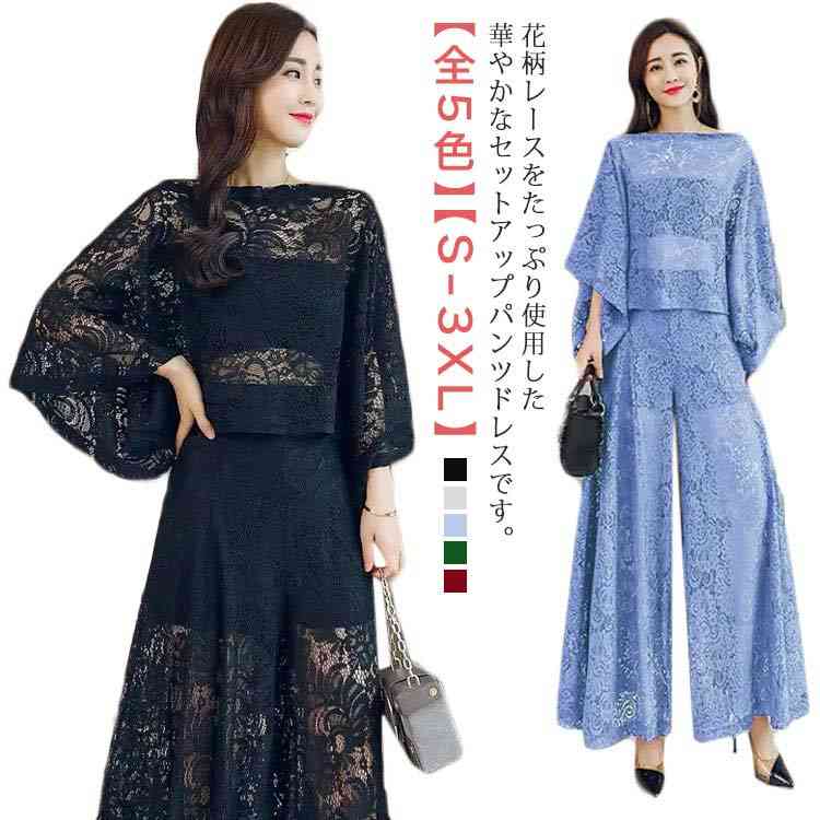 パンツドレス 総レース セットアップ 7分袖 シアー 透け感 二次会 パーティー 結婚式 大人 きれいめ
