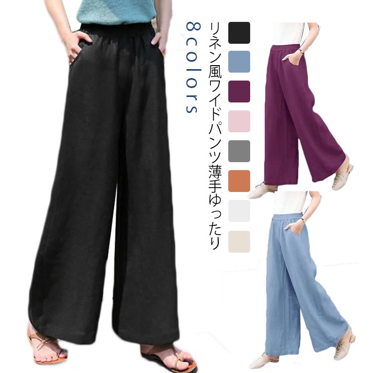 無地 ワイドパンツ レディース ボトムス 体型カバー 麻素材風レディースファッション ボトムス パンツ