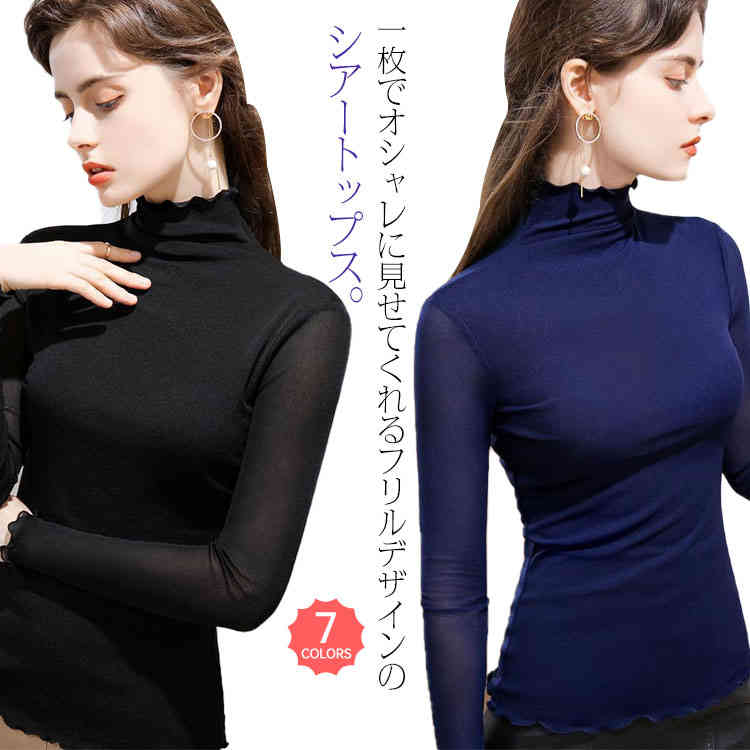 シアートップス 立ち襟 ボトルネック シアーカットソー 長袖 シースルー シースルー レイヤード ブラック ダークパープル 立ち襟
