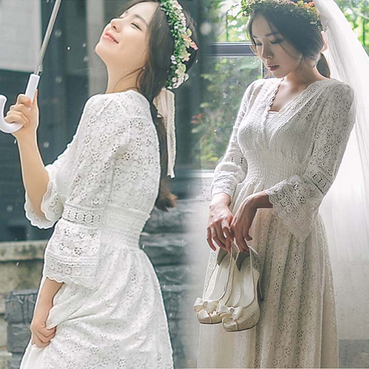 ワンピース 夏 レディース きれいめ 長袖 結婚式ドレス 通勤 ラッパ袖 vネック マタニティ ウェディングドレス ドレス 大人 ピアノ 発表会 大きいサイズ 結婚式 透かし彫り