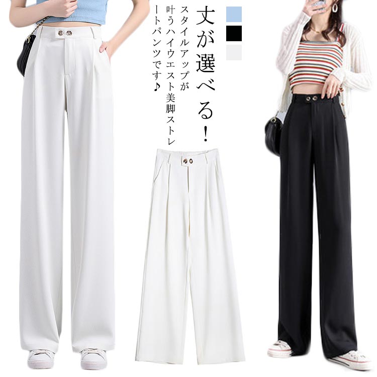 丈が選べる スタイルアップが叶う 接触冷感 で 涼しい 美脚 ハイウエスト ワイドパンツ 3色 ブラック ホワイト ブルー スッキリ 細見せ ロング丈 シワにならない