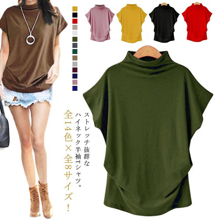 カットソー Tシャツ 半袖 レディース 無地 ハイネック 大人 女性 トップス ドルマン 重ね着 レイヤード 春 夏 ゆったり 体型カバー S-5XL