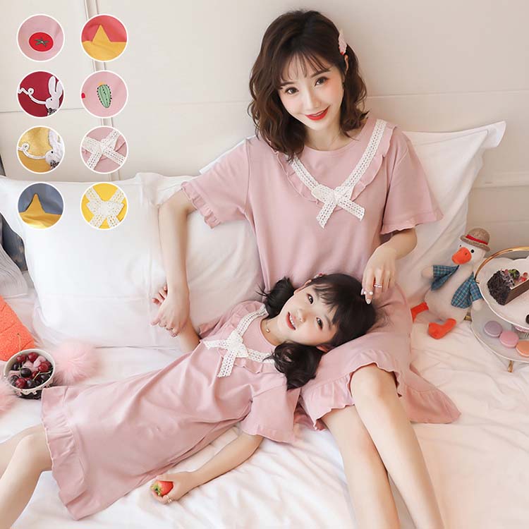 ルームウェア 親子 ペアルック ペア ワンピース 半袖 パジャマ お揃いコーデ 姉妹 ママ 娘 女の子 フリル 柄系 デザイン感 夏 綿 かわいい オシャレ 学生 妊婦
