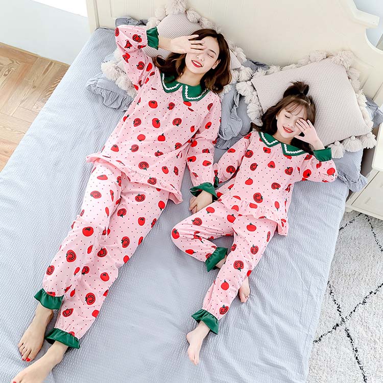 親子 ペアルック パジャマ トップス ロング丈ズボン ルームウェア トマト柄 総柄 トマト配色 緑丸襟 フリル かわいい オシャレ 親子 ペア お揃いコーデ ママ