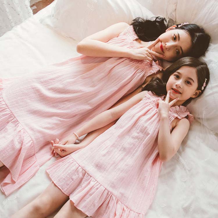 パジャマ 親子 ペア ペアルック ワンピース 袖なし 親子コーデ 吊りスカート ピンク 膝丈 フリル お揃いコーデ ママ 母 女の子 姉妹 ジュニア ナイトウェア