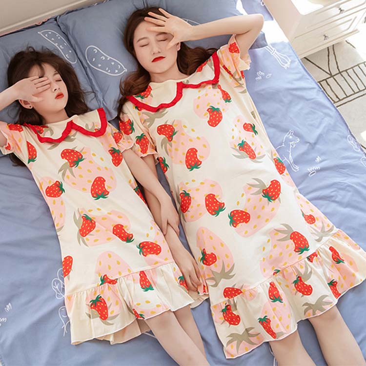 パジャマ 親子 ペアルック ロングワンピース 親子ペア ネグリジェ 半袖 イチゴ柄 総柄 フリル セーラーカラー 丸襟 かわいい お揃いコーデ 女性用 子供用