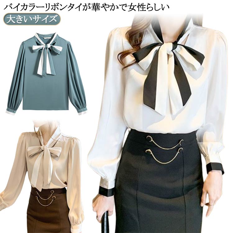 上品で可愛い パフスリーブ 長袖 シャツ トップス 韓国ファッション ボウタイ ブラウス 配色 ボウタイシャツ 二次会 パーティー フォーマル オフィスカジュアル お呼ばれ