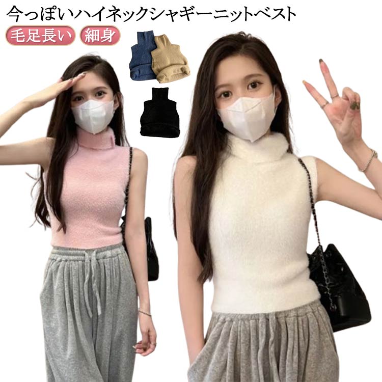 ハイネック シャギー ニットベスト もこもこ 起毛感 スリム ニットベスト レイヤード 重ね着 暖かい 防寒 伸縮性抜群