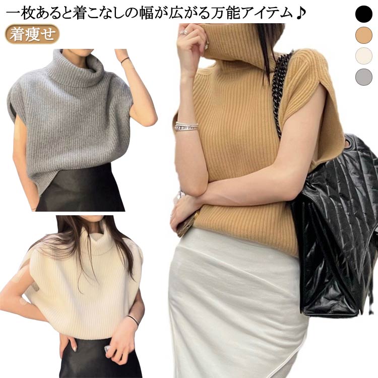 センスの高いフレンチスリーブニットベスト ハイネック タートルネック リブニット ベスト 袖なし ニットセーター 秋冬 レイヤード おしゃれ