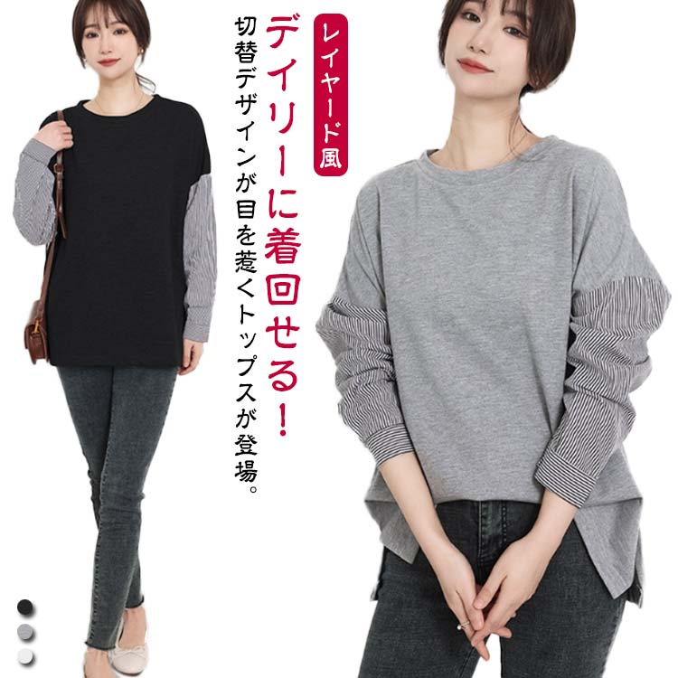 Tシャツ感覚 袖ストライプ ドッキング カットソー ブラウス 重ね着 レイヤード 長レディースファッション トップス Tシャツ カットソー