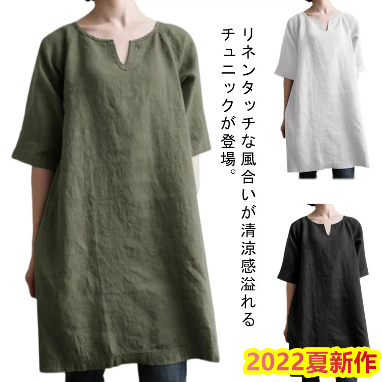 レディース Tシャツ 半袖 膝丈 tシャツ ロング チュニックワンピース キーネック 夏 トップス 無地 薄手 綿麻 コットンリネン 涼しい プルオーバー オーバーサイズ 通気性 ゆったり チュニック