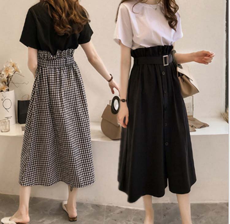 レディース トップス スカート 大きいサイズ 半袖 Tシャツ 白 ロング丈 スカート 黒 半袖Tシャツ チェック柄 長スカート 2種類選べる 淑女 ファッション おしゃれ 可愛い