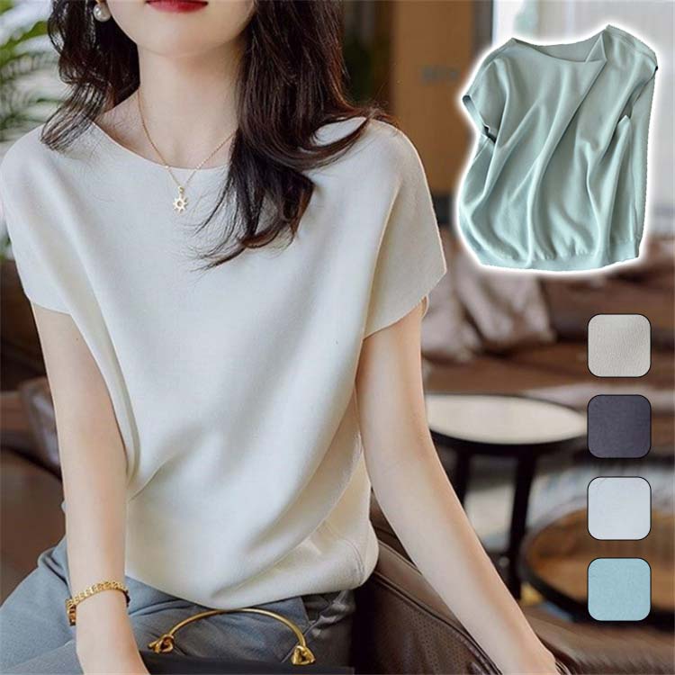 ニット 半袖 フレンチ袖 カットソー 半袖 レディース きれいめ シャツ レディース 半袖 ゆったり カジュアル 無地 フレンチスリーブ シャツ ブラウス ニット ボートネック