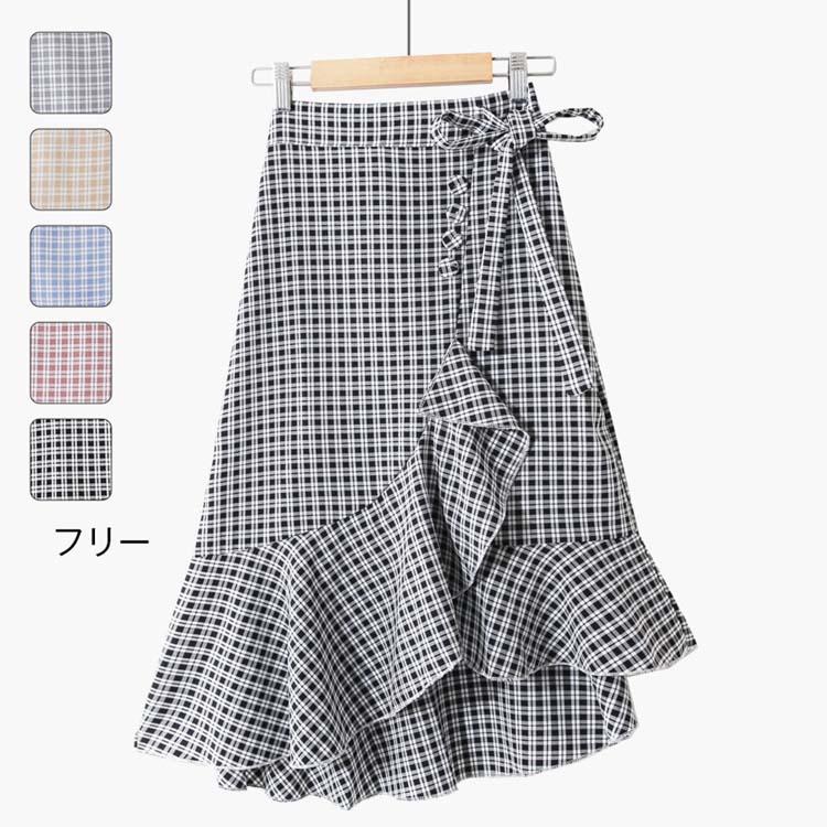 フレアスカート ロング 夏 春 膝丈 チェック柄 総柄 リボン インレギュラー ハイウェスト 着痩せ 体型カバー 10代 20代 30代 フリルデザイン ワンサイズ フリーサイズ