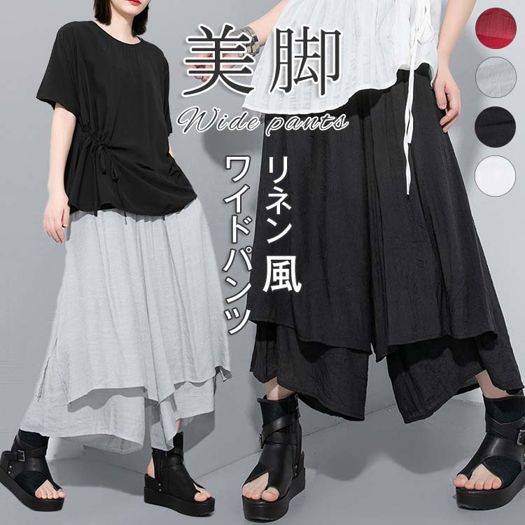 ワイドパンツ レディース パンツ リネン混 ダンスパンツ 麻 カラーパンツ ウエストゴム ロングパンツ ゆったり ドレープ スカート 袴 サルエルパンツ