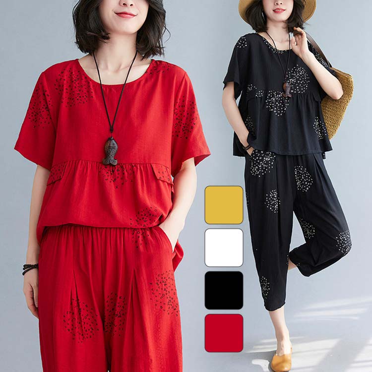 セットアップ レディース 40代 カジュアル 夏 大きいサイズ おしゃれ セットアップ ブラウス Tシャツ レディース セットアップ 半袖 おしゃれ 襟抜き カジュアル 花柄 七分丈