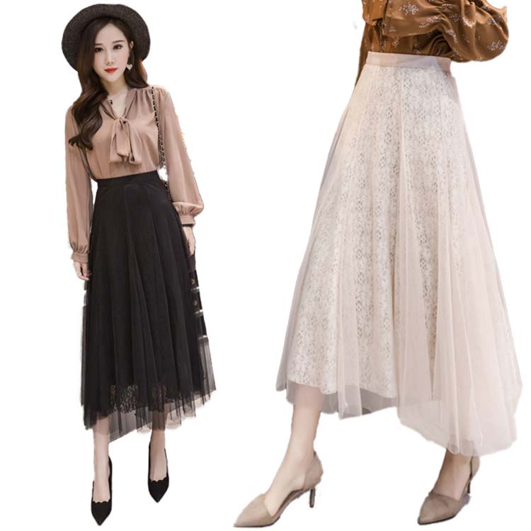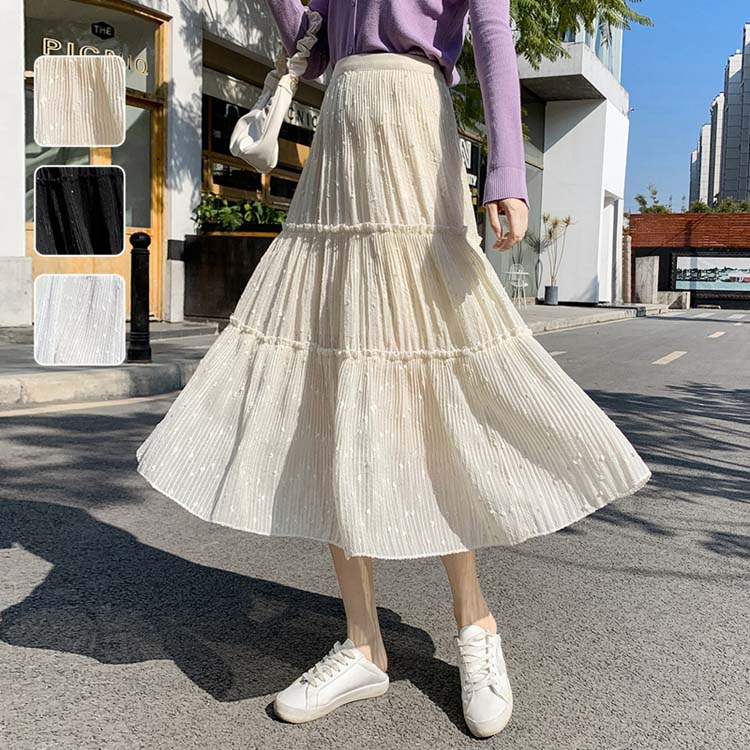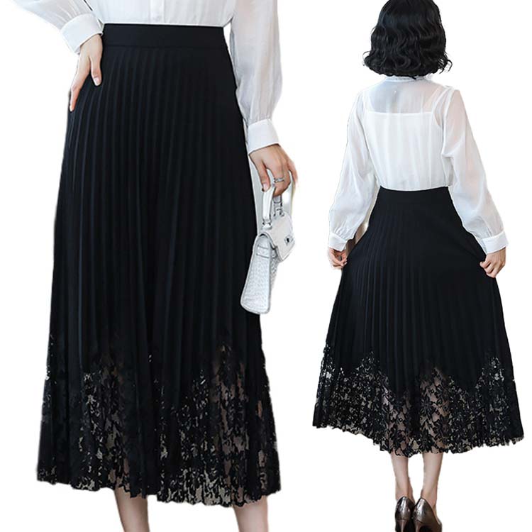プリーツスカート ロング丈スカート ミモレ丈 ロング 黒 レース レーススカート 無地 花柄 刺繍 ゆったり 大きいサイズ ハイウェスト ライン 2 3 上品 優雅