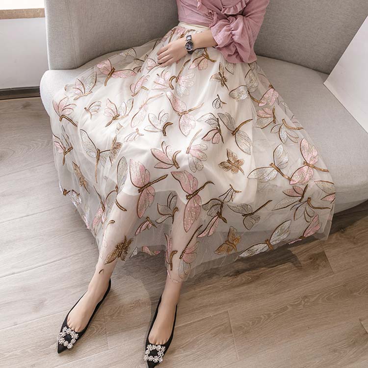 チュールスカート ロング ミモレ丈 蝶柄 刺繍 腰締め ライン 着痩せ 体型カバー 脚長見え ファッション 個性 薄手 2 おしゃれ 優雅 カジュアル ロングスカート