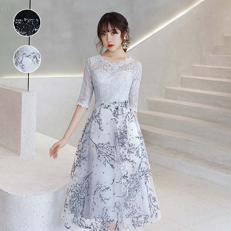 パーディードレス レディース 七分袖 ワンピース ドレス イブニングドレス レース 花柄 ロング丈 フォーマル オシャレ 優雅 上品 高級感 披露宴 司会 結婚式