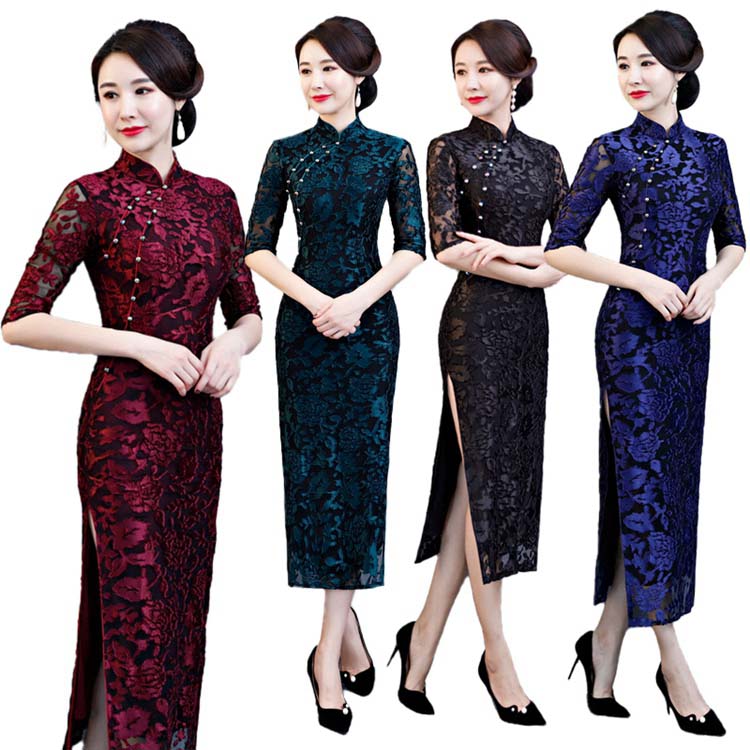 ロングチャイナドレス 古典漢服 ベルベット 中国風 ママ ドレス フォマールドレス 刺繍 レース美シルエット チャイナドレス スタジオ 舞台演出服 撮影ドレス
