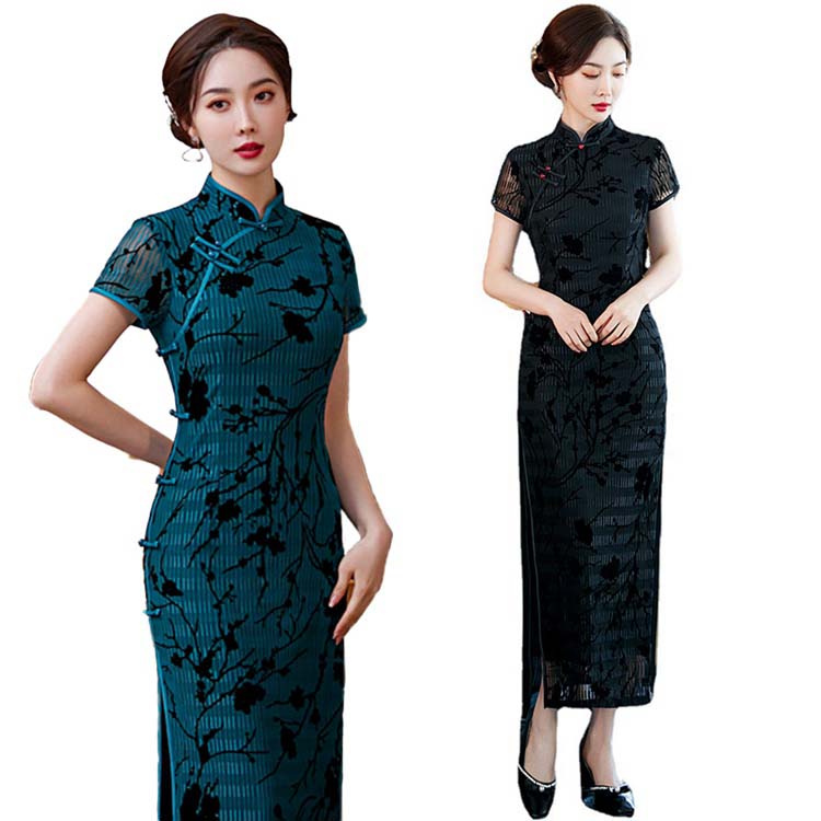 チャイナドレス レース 半袖 レディース ロング丈 黒 暗色系 チャイナドレス 花柄 エレガント シック 雰囲気 中華服 チャイナ服 ロング パーティードレス 二次会 演奏会