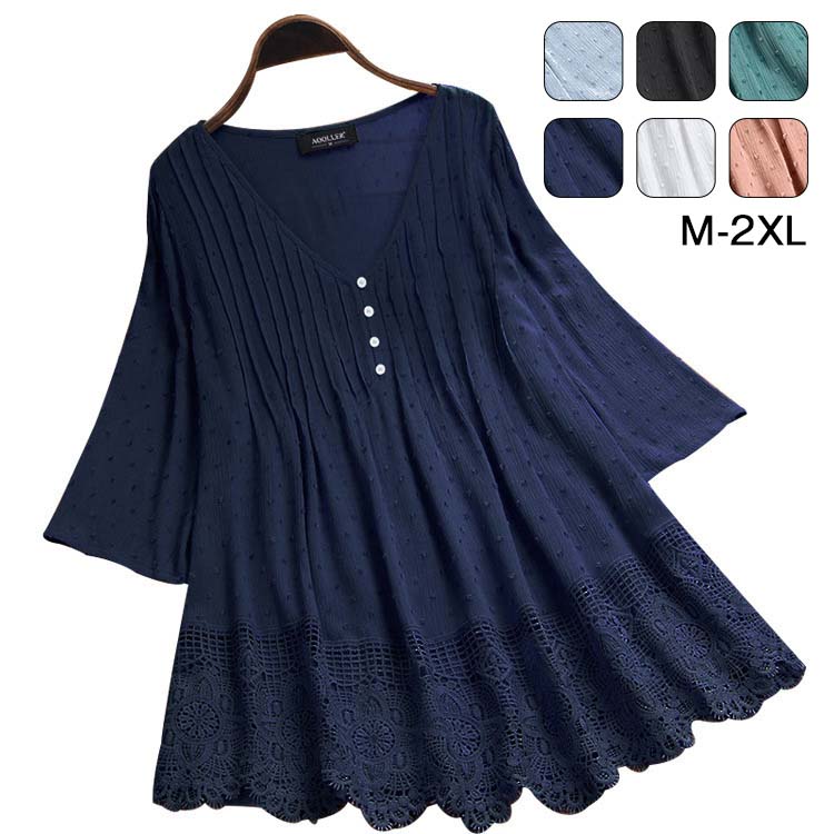 チュニック シャツ 半袖 レディース 大きいサイズ おしゃれ 無地 五分袖 シャツワンピ 膝丈 無地 スリット vネック 綿 着痩せ ゆったり 大きいサイズ 体型カバー レース