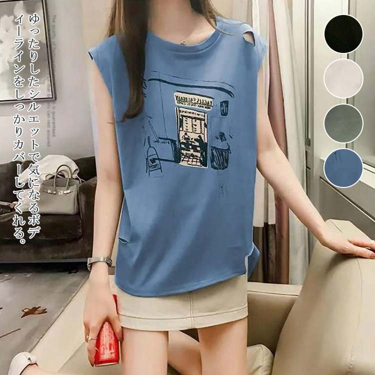 ノースリーブ レディース シャツ 春 夏 タンクトップ フレンチスリーブ ラウンドネック ゆったり ダメージ 袖なし カジュアル シンプル ストレッチ トップス