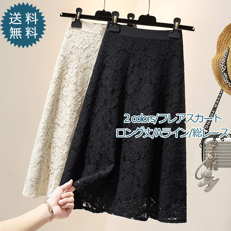 フレアスカート レディース ロングスカート 総レース Aライン 膝丈 無地 ハイウエスト 着痩せ 通勤 ボトムス カジュアル 春夏秋 ゆったり おしゃれ