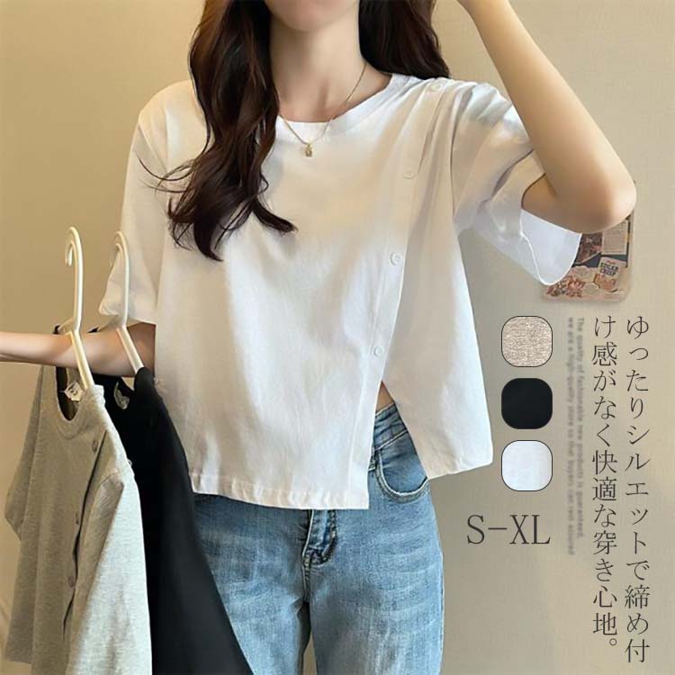 Tシャツ レディース 五分袖 トップス カットソー 半袖tシャツ ショート丈 プルオーバー カジュアル クルーネック ゆったり 薄手 無地 ボタン おしゃれ S M L XL 2XL