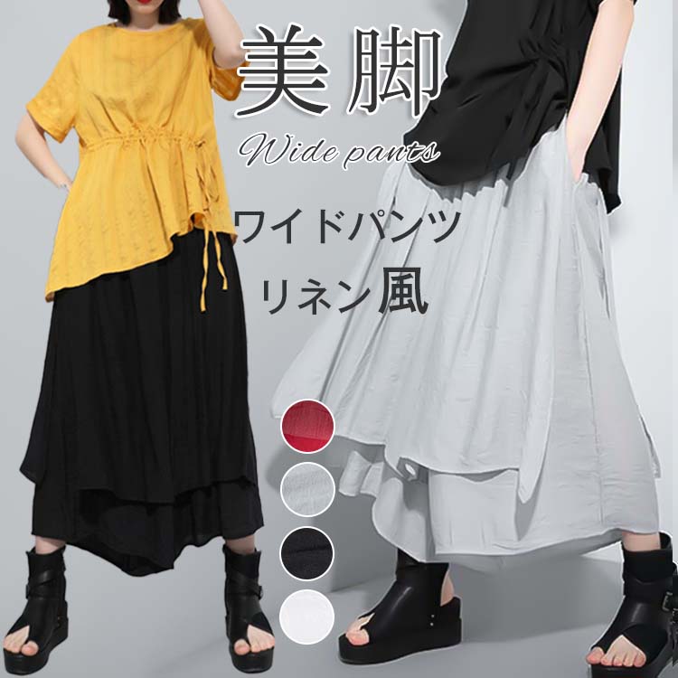 ワイドパンツ レディース ロングパンツ リネン ボトムス ガウチョパンツ ロング フレアワイドパンツ ゆったり 体型カバー ウエストゴム リネンパンツ