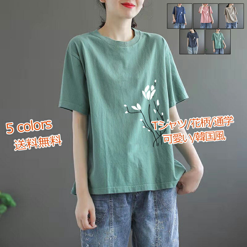 Tシャツ レディース 半袖 花柄 シンプル クルーネック カジュアル トップス 可愛い 通学 スポーツ 韓国風 きれいめ 22年夏新作 おしゃれ