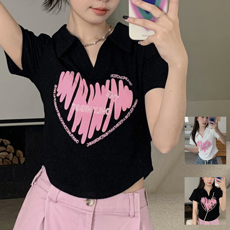 シャツ 半袖 レディース 夏 トップス 可愛い ハート柄 夏服 大きいサイズ おしゃれ ネック レディース シャツ 韓国風 プレゼント 夏 着 せ 白 黒