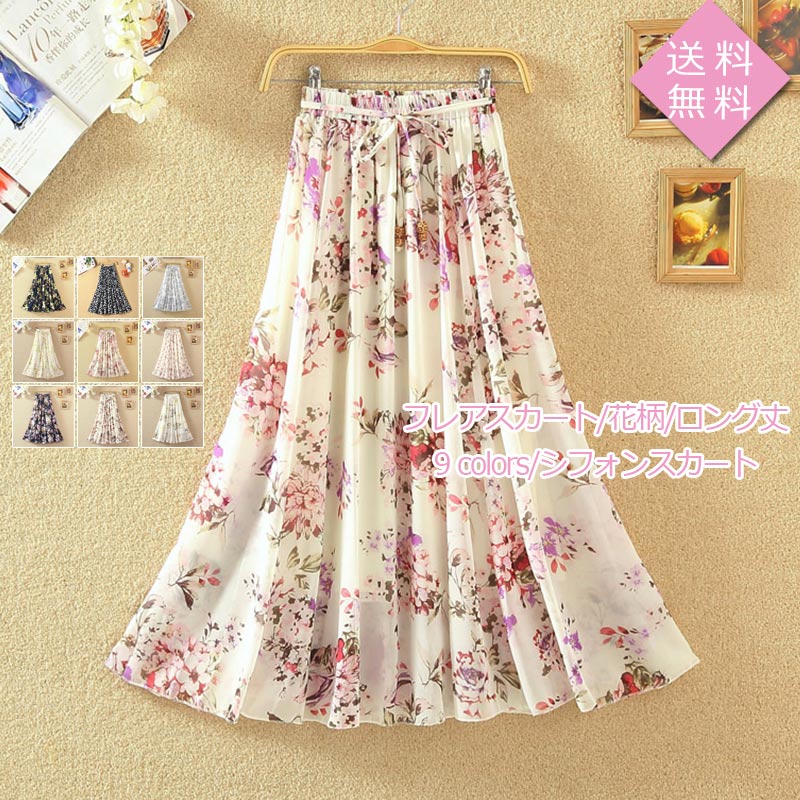 シフォンスカート スカート シフォン レディース フレアスカート 花柄 総花柄 80CM ロング丈 ウエストゴム ボトムス カジュアル ハイウエスト 春夏 きれいめ オシャレ