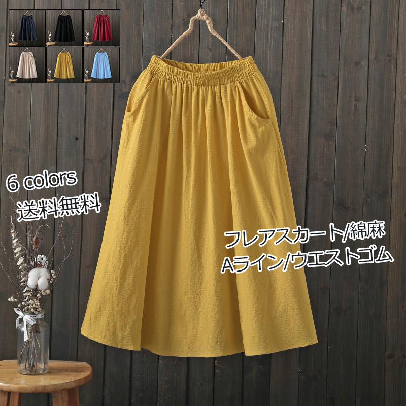 フレアスカート レディース リネンスカート 無地 ロング丈 ハイウエスト ポケット付き Aライン 膝下 ミモレ丈 春秋冬 オフィス カジュアル おしゃれ
