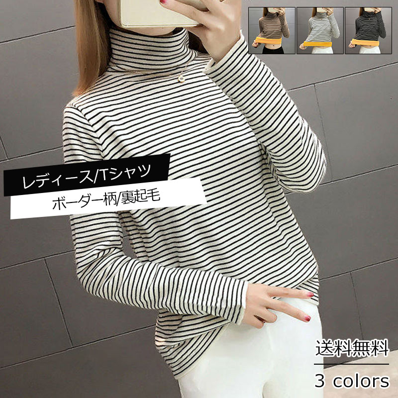 Tシャツ レディース ニットセーター ハイネック 裏起毛 ボーダー柄 長袖 インナー 着痩せ あったか トップス 秋冬 きれいめ おしゃれ